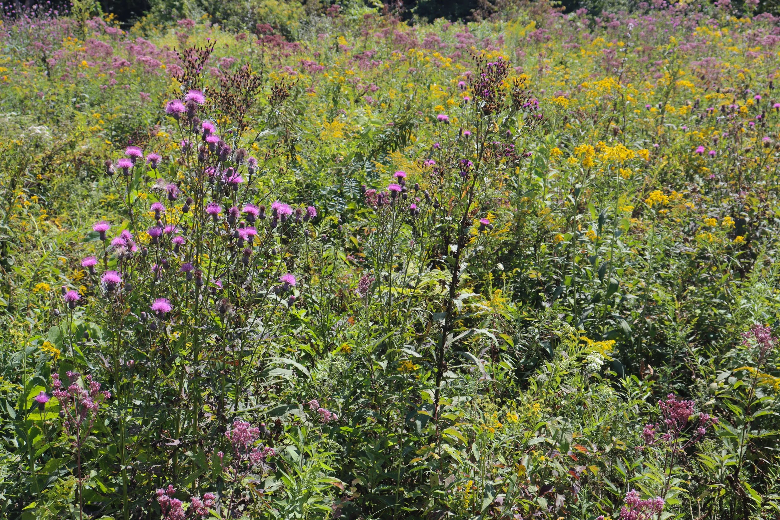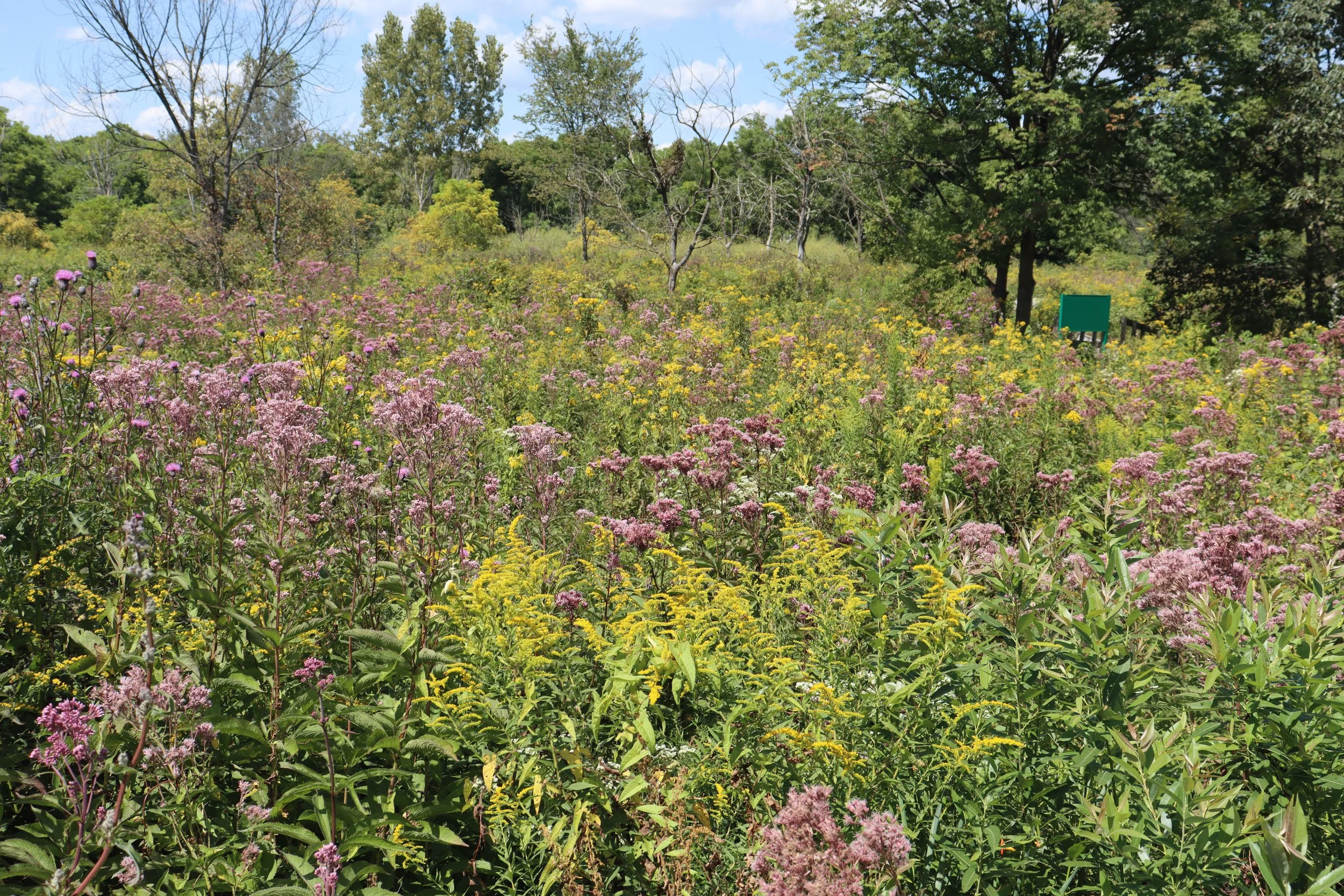 Pearl’s Fen in Southwest Ohio, early September 2025. The primary visible blooms are Joe Pyeweed (Pink), Common Boneset (White), Wingstem (Yellow), Swamp Goldenrod (Yellow), Tall Goldenrod (Yellow), and Swamp Thistle (Darker Pink). This natural wetland features a high water table and spring fed creek throughout the year, even through dry spells and drought.