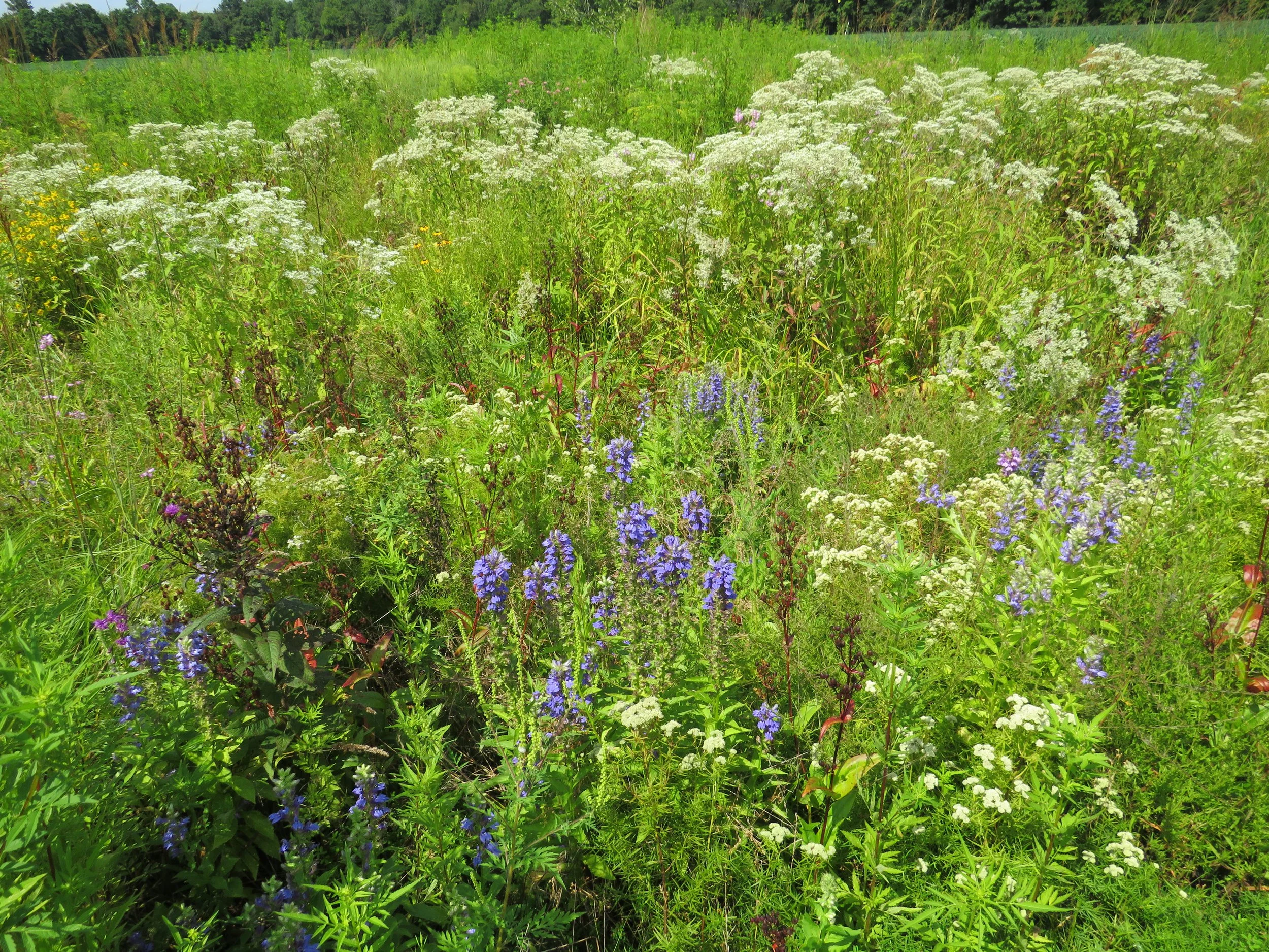 Arrowhead species - Sagittaria species, Water horehound - Lycopus americanus, Obedient Plant Species (Physostegia species), Cardinal Flower - Lobelia cardinalis, Great Blue Lobelia - Lobelia siphilitica, Prairie Dock - Silphium terebinthinaceum, Groundnut - Apios americana, Ironweed Species (Vernonia species) Wingstem - Verbesina alternifolia, Cut-leaf Coneflower - Rudbeckia laciniata, Orange Coneflower Rudbeckia fulgida var. sullivantii, Hibiscus species, Meadow Beauty - Rhexia virginica, Common Sneezeweed - Helenium autumnale, Purple Headed Sneezeweed - Helenium flexuosum, Marsh Blazing Star Liatris spictata, Mistflower - Conoclinium coelestinum, Hollowstem Joe Pye Weed - Eutrochium fistulosum, Joe Pye Weed - Eutrochium maculatum, Common Boneset- Eupatorium perfoliatum, Orange Jewel Weed - Impatiens capensis, Tickseed Species - Bidens species, Tall Sunflower - Helianthus giganteus, Swamp Thistle - Cirsium muticum, Grassleaf Goldenrod - Euthamia graminifolia, Tall Goldenrod Solidago gigantea, Riddell’s Goldenrod Oligoneuron riddelli, Marsh Betony - Pedicularis lanceolata, Native Smartweeds (Native Persicaria species)