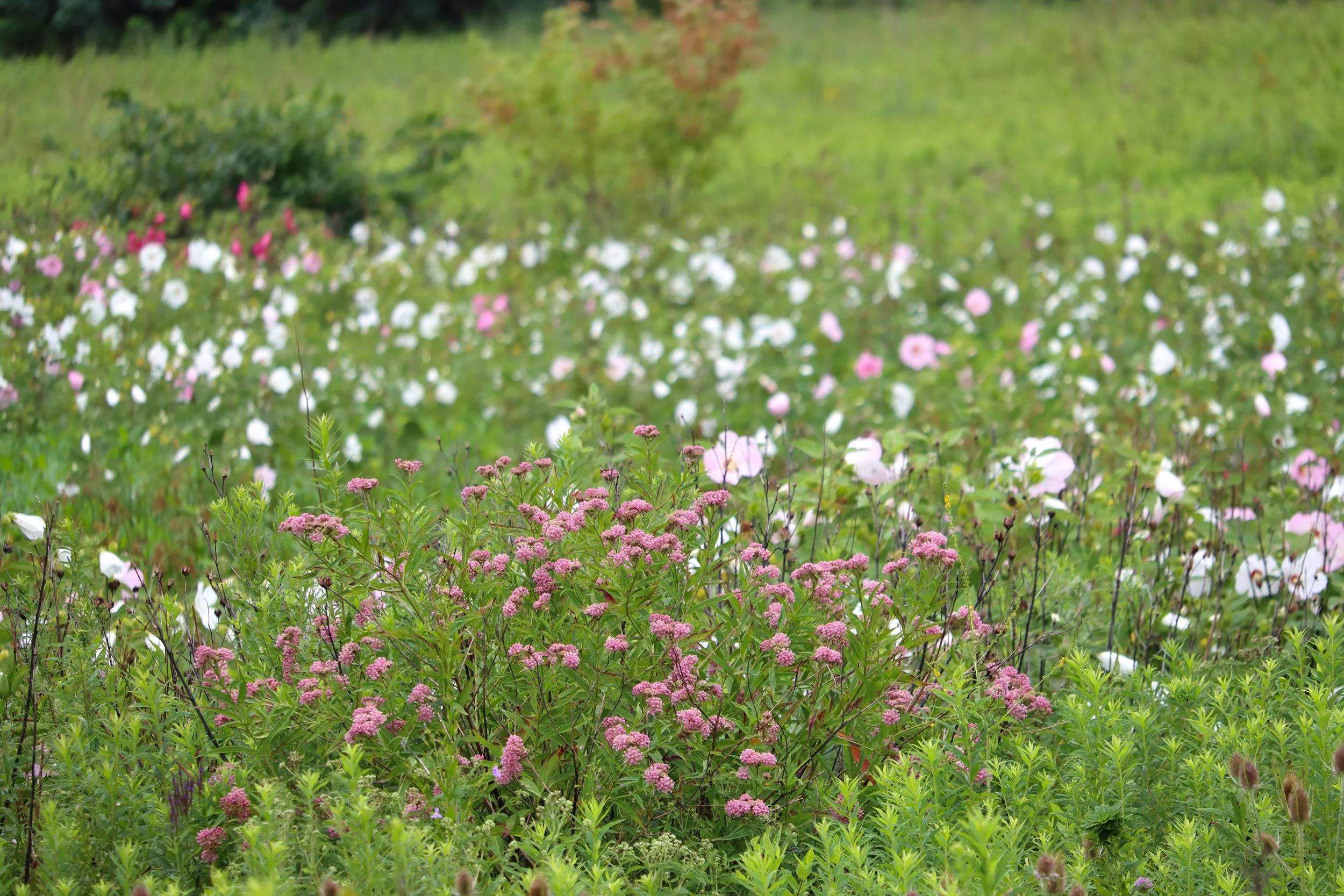 Swamp Milkweed graces the foreground of a large Rose Swamp Mallow population in the background.