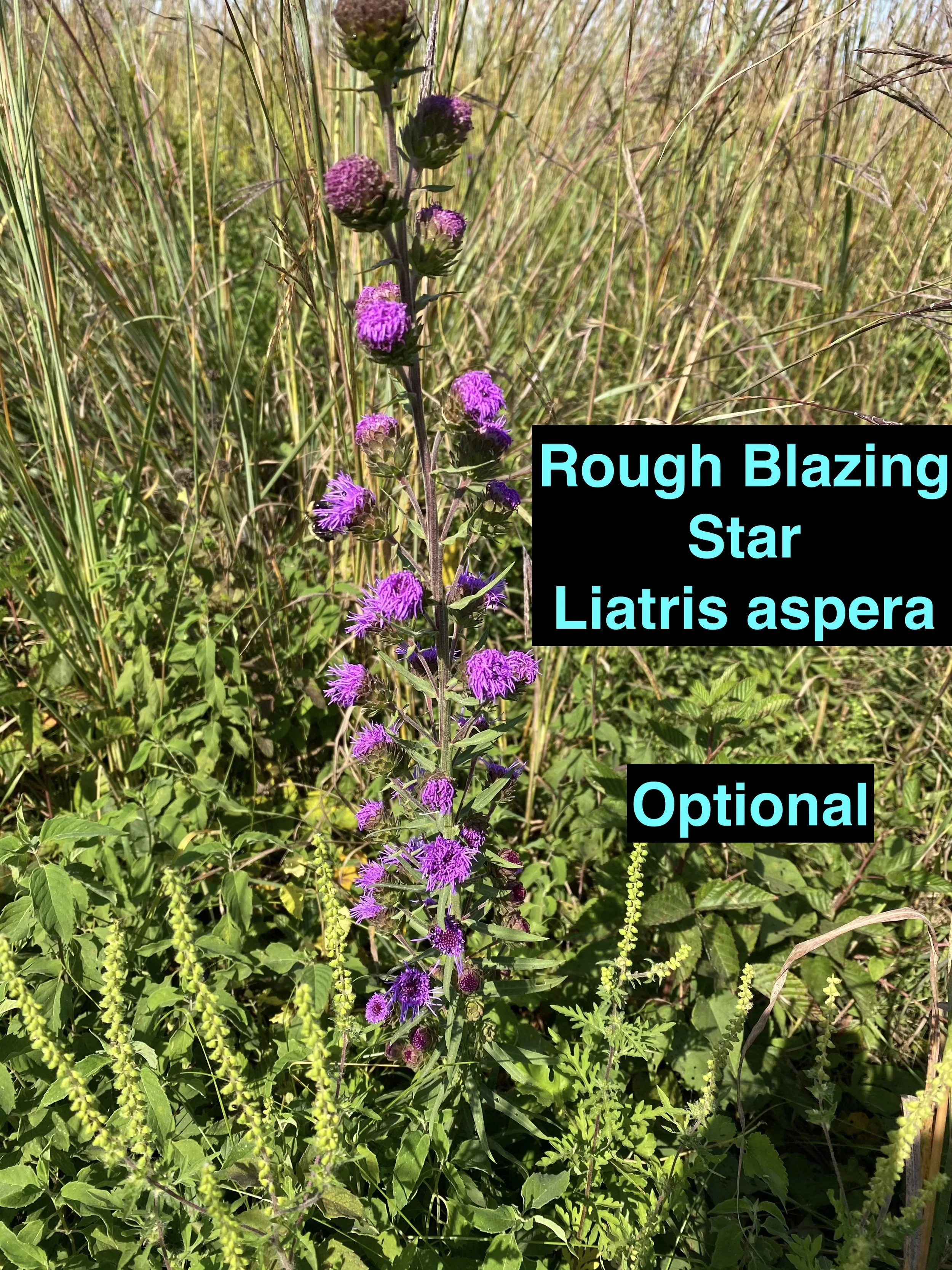 Midwest/Southeast Optional Species: Purple Prairie Clover Dalea purpurea (Optional), Hoary Vervain Verbena stricta (Optional), Button Blazing Star Liatris aspera (Optional).