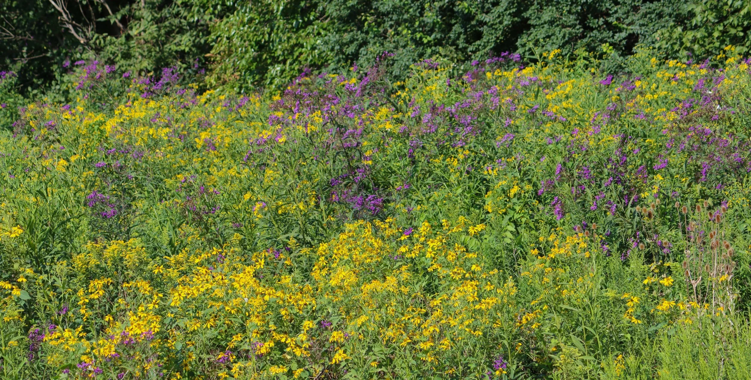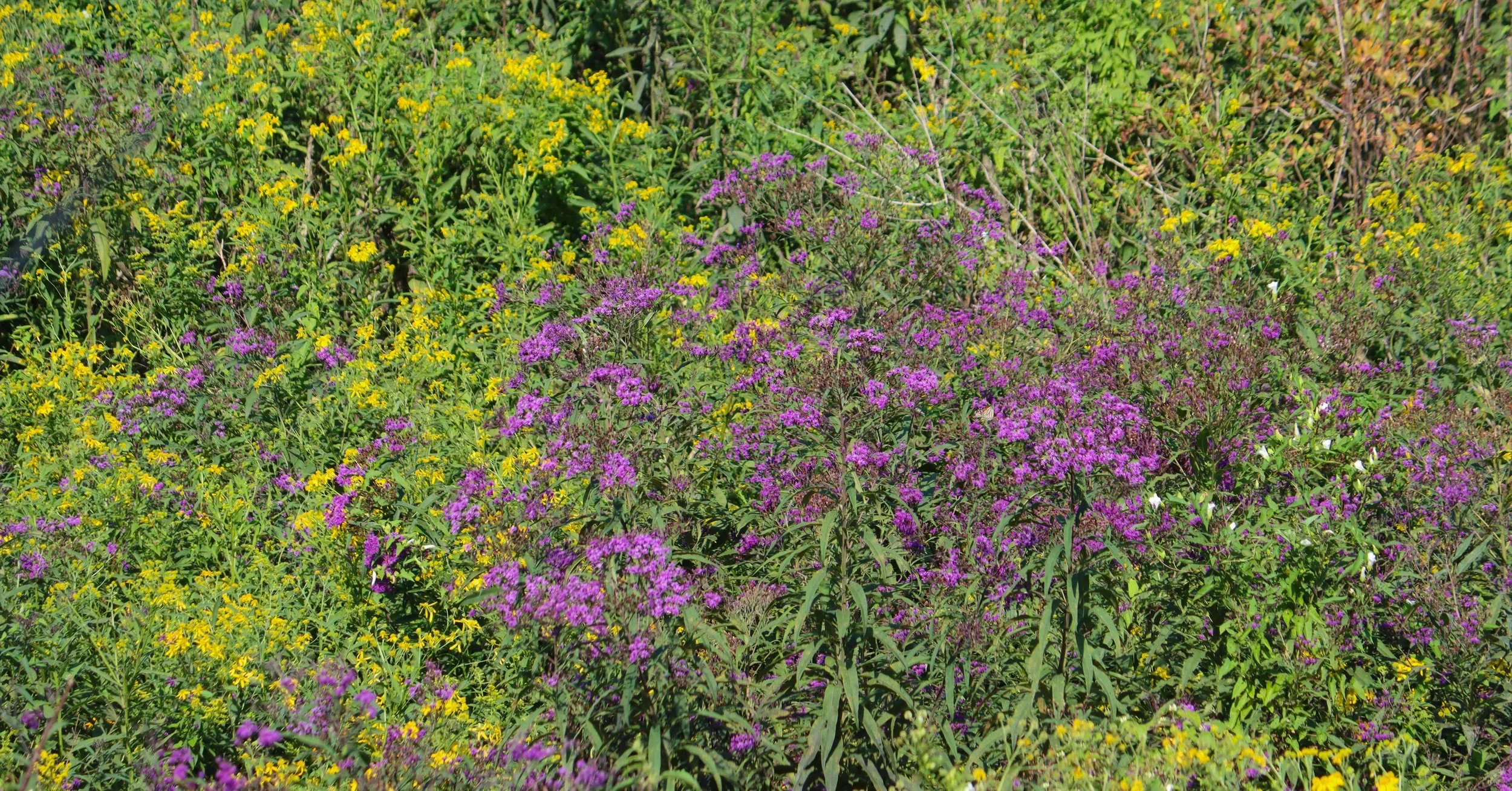 Species list: Yarrow Achillea millefolium, Common Milkweed Asclepias syriaca, Smooth Blue Aster Aster laevis, New England Aster Aster novae-angliae, Frost Aster Aster pilosus, Canada Milk Vetch Astragalus canadensis, Fox Sedge Carex vulpinoidea, Partridge Pea Chamaecrista fasciculata, Purple Coneflower Echinecea Purpurea, Hollow-stem Joe pye Eupatorium fistulosum, Grass leaf goldenrod Euthamia gramnifolia, Oenothera biennis Evening Primrose, Tall Sunflower Helianthus giganteus, Early Sunflower Heliopsis helianthoides, Rounded Headed Bush Clover Lespedeza capitata, Wild Bergamot Monarda Fistulosa, Foxglove Beardtongue Penstemon digitalis, Virginia Mountain Mint Pycnanthemum virginianum, Obedient Plant Physostegia virginiana, Cut-leaf Coneflower Rudbeckia laciniata, Black Eyed Susan Rudbeckia hirta, Wild Senna Senna hebecarpa, CUp Plant Silphium perfoliatum, Early Goldenrod Solidago juncea, Dwarf aka Gray Goldenrod Solidago nemoralis, Stiff Goldenrod Solidago Ridgida, Showy Goldenrod Solidago speciosa, Ohio Spiderwort Tradescantia ohioensis, Purple Top Tridens Flavus, Wingstem Verbesina alternifolia, Tall Ironweed Vernonia gigantea, Culver's Root Veronicastrum virginicum, Golden Alexanders Zizia aurea