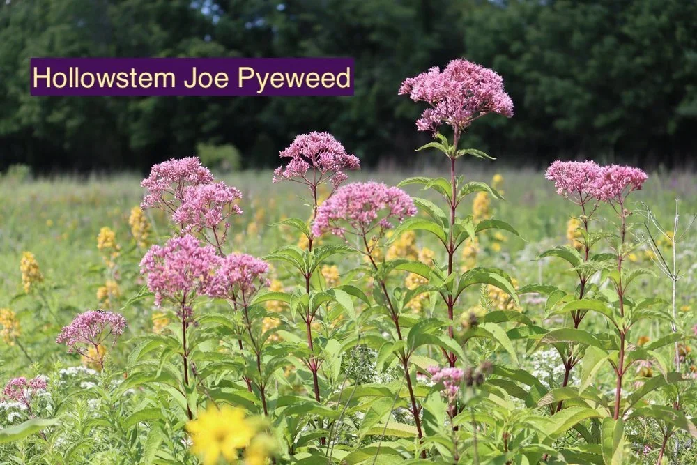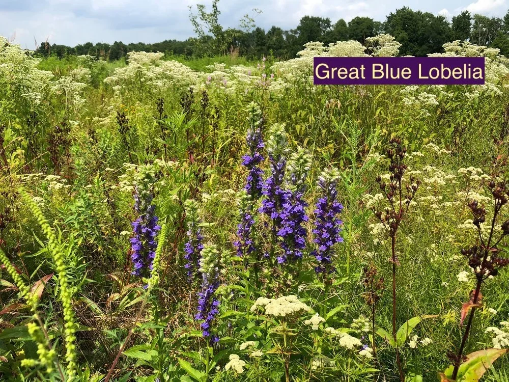 Species List: Purple Coneflower - Echinecea Purpurea, Foxglove Beardtongue - Penstemon digitalis, Slender Mountain Mint - Pycnanthemum tenuifolium, Orange Coneflower - Rudbeckia fulgida, Dwarf Goldenrod - Solidago nemoralis, Showy Goldenrod - Solidago speciosa, Marsh Blazing Star Liatris spicata, Great Blue Lobelia - Lobelia siphilitica, Golden Alexanders - Zizia aurea, Native Yarrow Achillea millefolium, Downy Wood Mint - Blephilia cillata, New England Aster - Aster novae-angliae, Smooth Blue Aster - Aster laevis, Rattlesnake Master - Eryngium yuccifolium, Ohio Spiderwort Tradescantia ohiensis, Wild Bergamot - Monarda Fistulosa, Black Eyed Susan - Rudbeckia hirta, Early Sunflower Heliopsis helianthoides, Spotted Bee Balm - Monarda punctata
