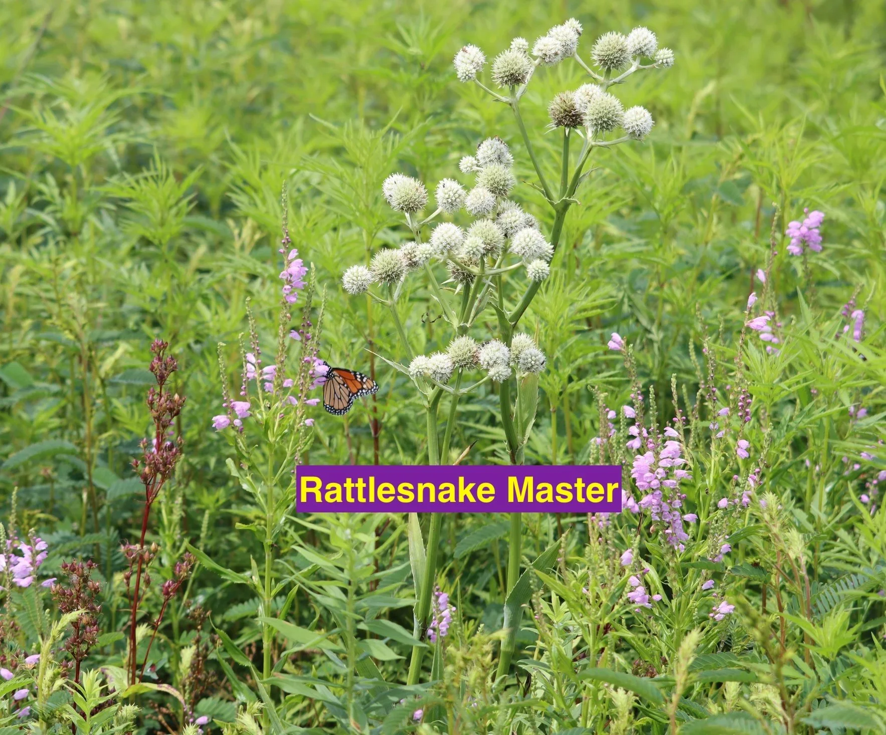 Wild Bergamot Monarda fistulosa, Pycnanthemum virginianum Virginia Mountain Mint, Grey Headed Coneflower Ratibida pinnata, Purple Coneflower Echinacea purpurea, Oxeye Sunflower Heliopsis helianthoides, Culver's Root Veronicastrum virginicum, Maryland Senna Senna marilandica, Marsh Blazing Star Liatris spicata, Early Goldenrod Solidago juncea, Spotted Bee Balm Monarda punctata, Dalea purpurea Purple Praire Clover, Astragalus canadensis Canada Milk Vetch, Desmodium canadense Showy Trefoil, Hoary Vervain Verbena stricta, Evening Primrose Oenothera biennis, Eryngium yuccifolium Rattlesnake Master, Cup Plant Silphium perfoliatum - limited amount to maintain species balance.